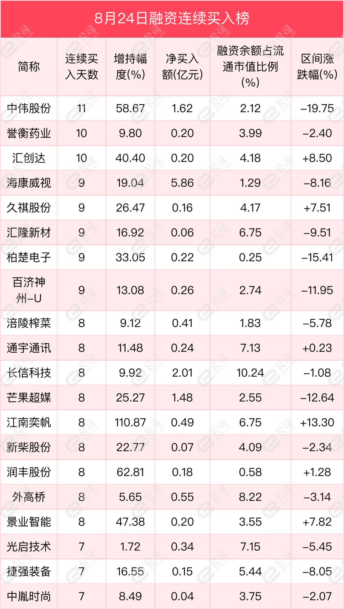 从连续买卖来看,中伟股份、誉衡药业、汇创达获融资连续净买入天数居前,分别为11天、10天、10天,期间净买入额分别为1.62亿元、0.2亿元、0.2亿元,期间增持幅度分别为58.67%、9.8%、40.4%。