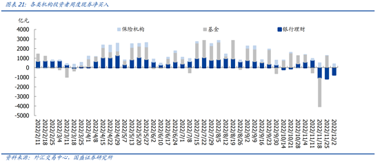 据国盛证券统计,上周(11/28-12/02)银行理财净卖出现券756亿元,包括利率债减持210 亿元,信用债减持270亿元,存单减持276亿元。基金净买入现券105亿元,包括利率债减持91亿元,信用债增持124亿元,存单增持72亿元。现券主力买盘来自农商行,华安证券数据显示,农商行上周净买入762亿元,主要配置国债、同业存单。
