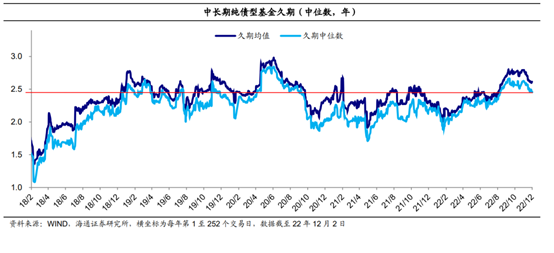 海通证券数据显示,截至12月2日中长期纯债型基金久期均值和中位数分别为2.61年、2.46年,较11月25日分别缩短约0.01年、缩短约0.03年,分别处于近三年以来的82%、75%分位数。其中,中位数2.46年创8月19日当周以来新低。银行持债久期缩短0.02年至4.84年,处近三年87%分位数。