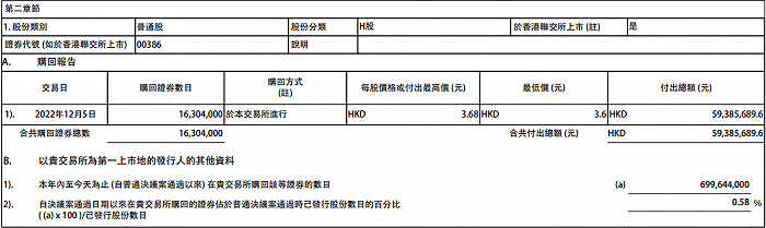 中国石油化工股份12月5日在港交所公告称,12月5日斥资5938.57万港元购回1630.4万股公司股份。