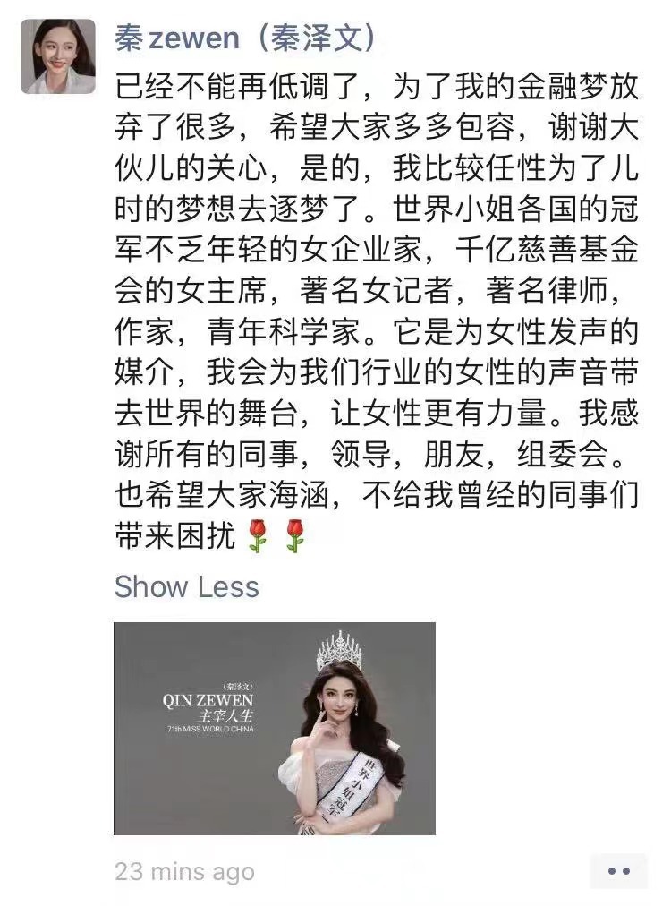 8月22日晚间,“第71届世界小姐中国区大赛”微博发文宣布,秦泽文将代表中国区出战第71届世界小姐全球总决赛。