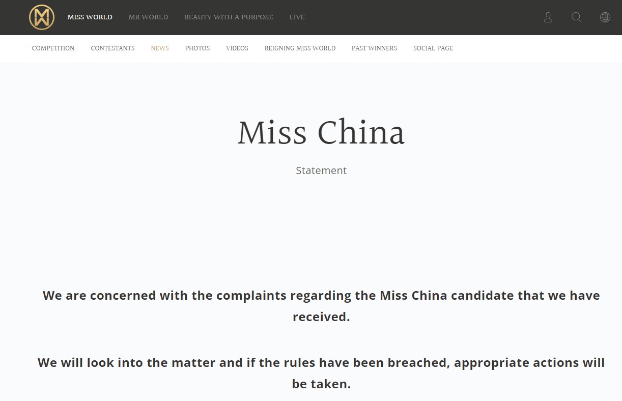 8月24日,世界小姐官网回应称已收到相关投诉并予以关注。主办方将调查此事,如果违反规定,将采取适当行动。