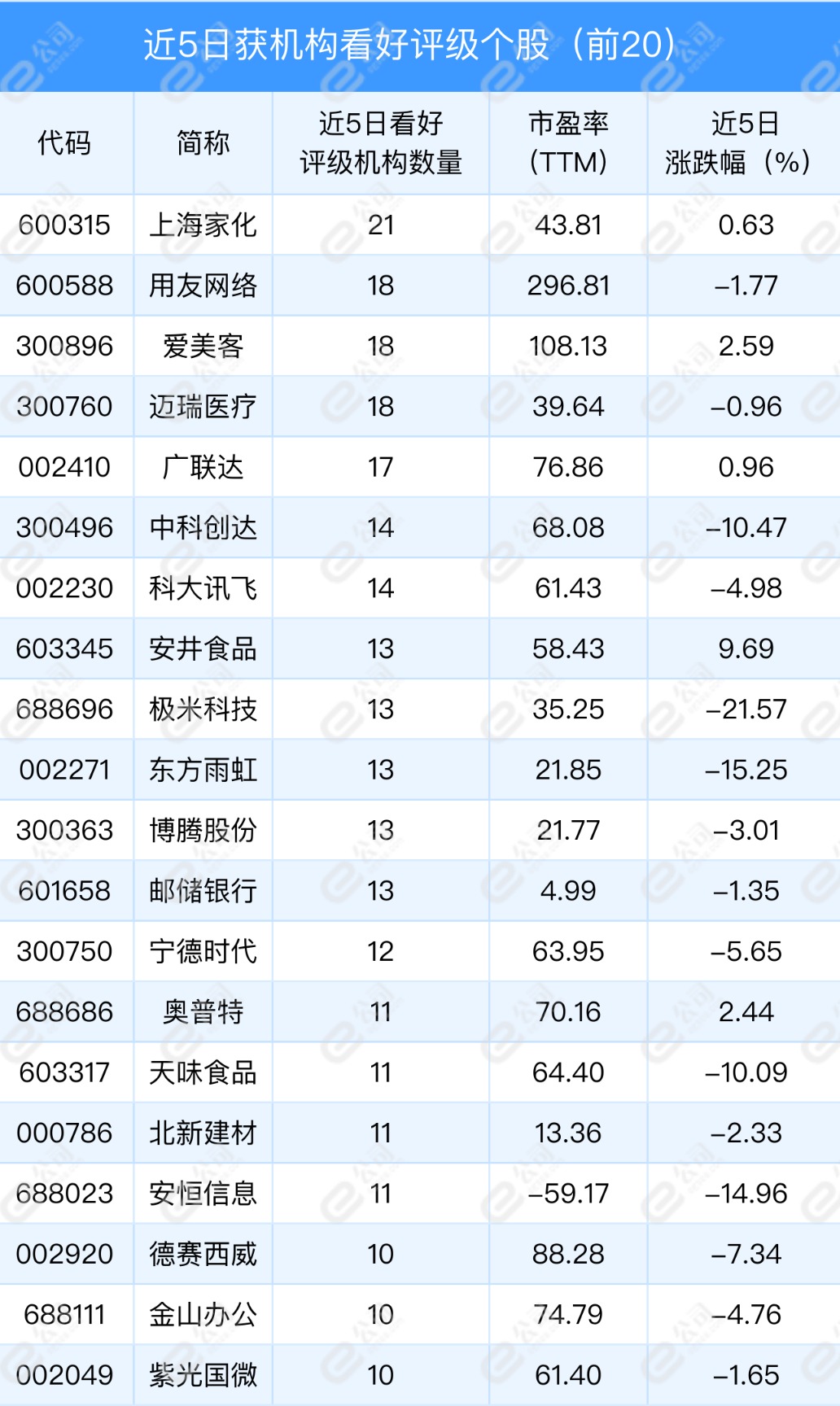 204只个股在近期被机构集中推荐,近5日内机构给予“买入”或“增持”等看好评级家数均逾3家及以上。具体来看,上海家化(21家)、用友网络(18家)、爱美客(18家)、迈瑞医疗(18家)、广联达(17家)、中科创达(14家)、科大讯飞(14家)、安井食品(13家)等8只个股近期机构看好评级家数居前,均达到5家以上,此外,包括和元生物、爱博医疗、妙可蓝多、日月股份、美迪西等在内的30只个股期间机构看好评级家数均在2家以上。