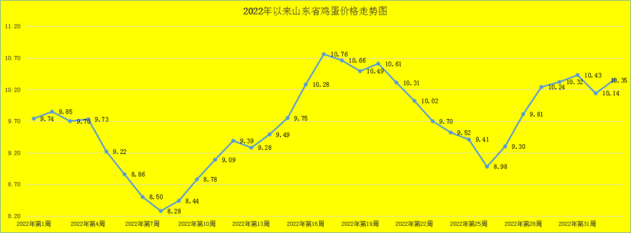 最新一周山东省畜产品监测显示,今年第33周(8月15日-8月21日),全省鸡蛋价格回升。