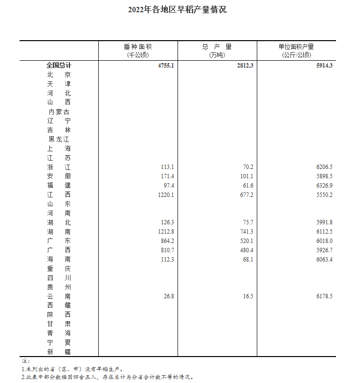 据国家统计局8月26日消息,国家统计局发布关于2022年早稻产量数据的公告。根据对早稻的实割实测抽样调查推算,2022年全国早稻播种面积、单位面积产量、总产量如下: