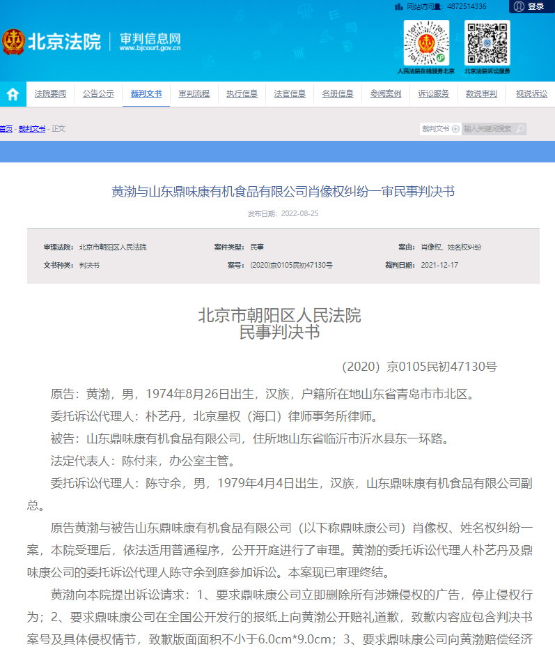 据北京法院审判信息网消息,近日,黄渤与山东鼎味康有机食品有限公司姓名权纠纷民事一审判决书公布。