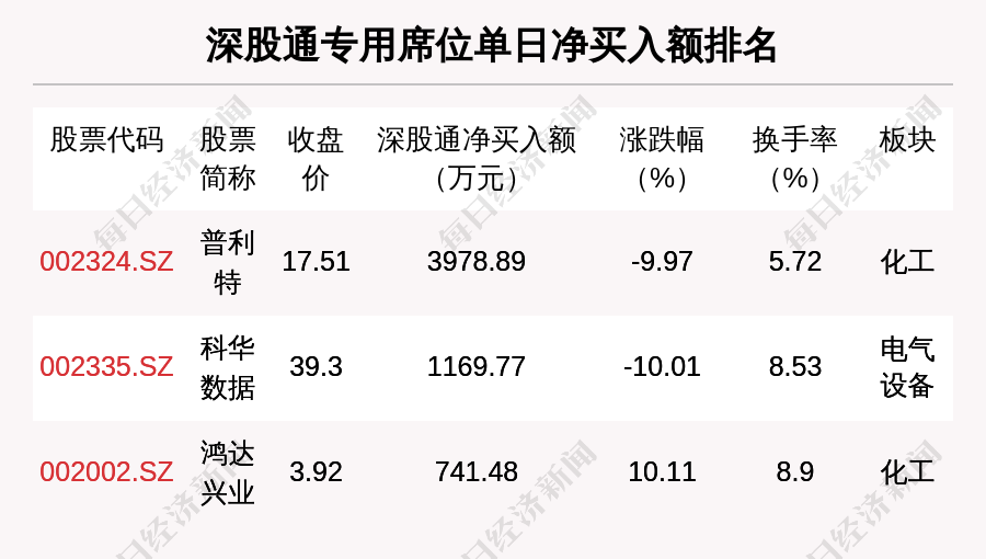 在龙虎榜中,涉及深股通专用席位的个股有3只,普利特的深股通专用席位净买入额最大,净买入3978.89万元。