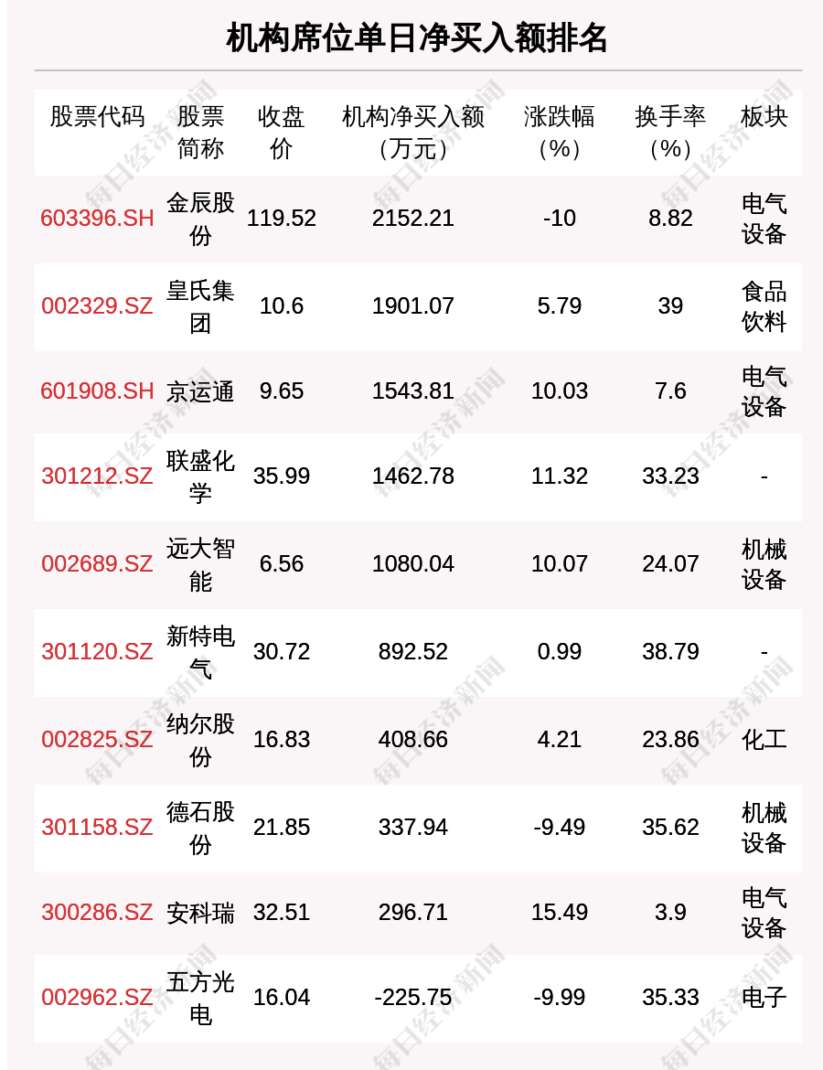 在龙虎榜中,涉及机构专用席位的个股有17只,净买入额前三的是金辰股份、皇氏集团、京运通,分别为2152.21万元、1901.07万元、1543.81万元。